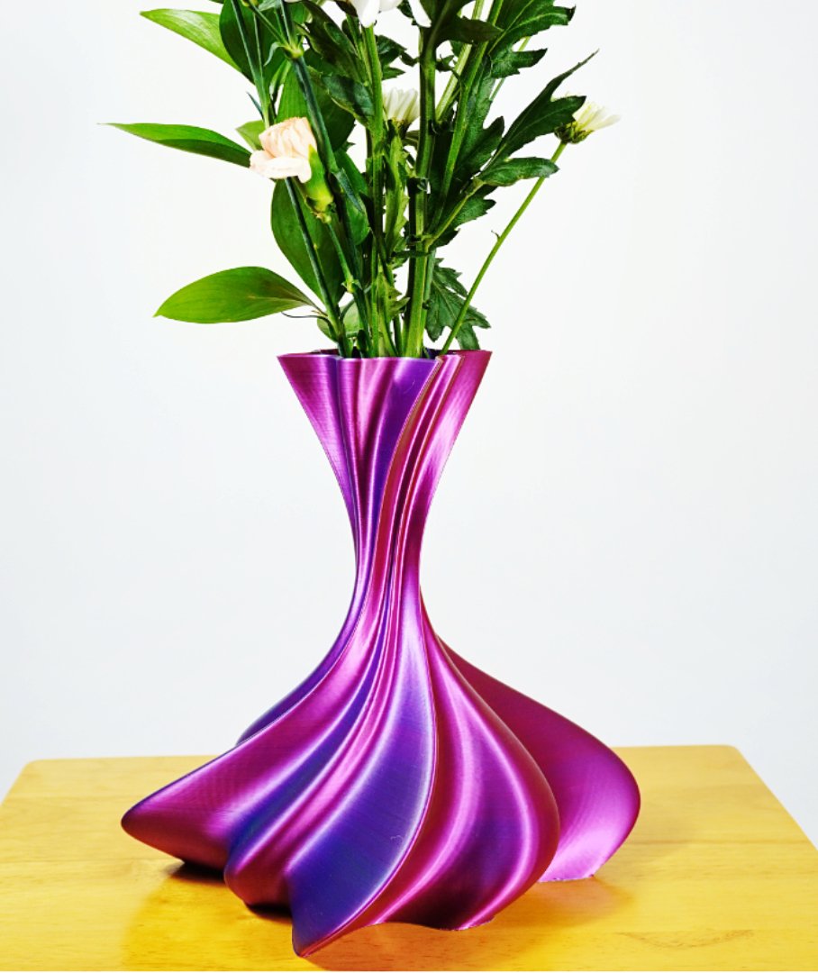 Elevate your space with this futuristic 3D printed vase — a true blend of modern technology and sculptural elegance. Designed with bold, flowing curves and printed in a mesmerizing chameleon filament, this vase shimmers between deep purples and electric blues, or different colors , shifting beautifully under the light.