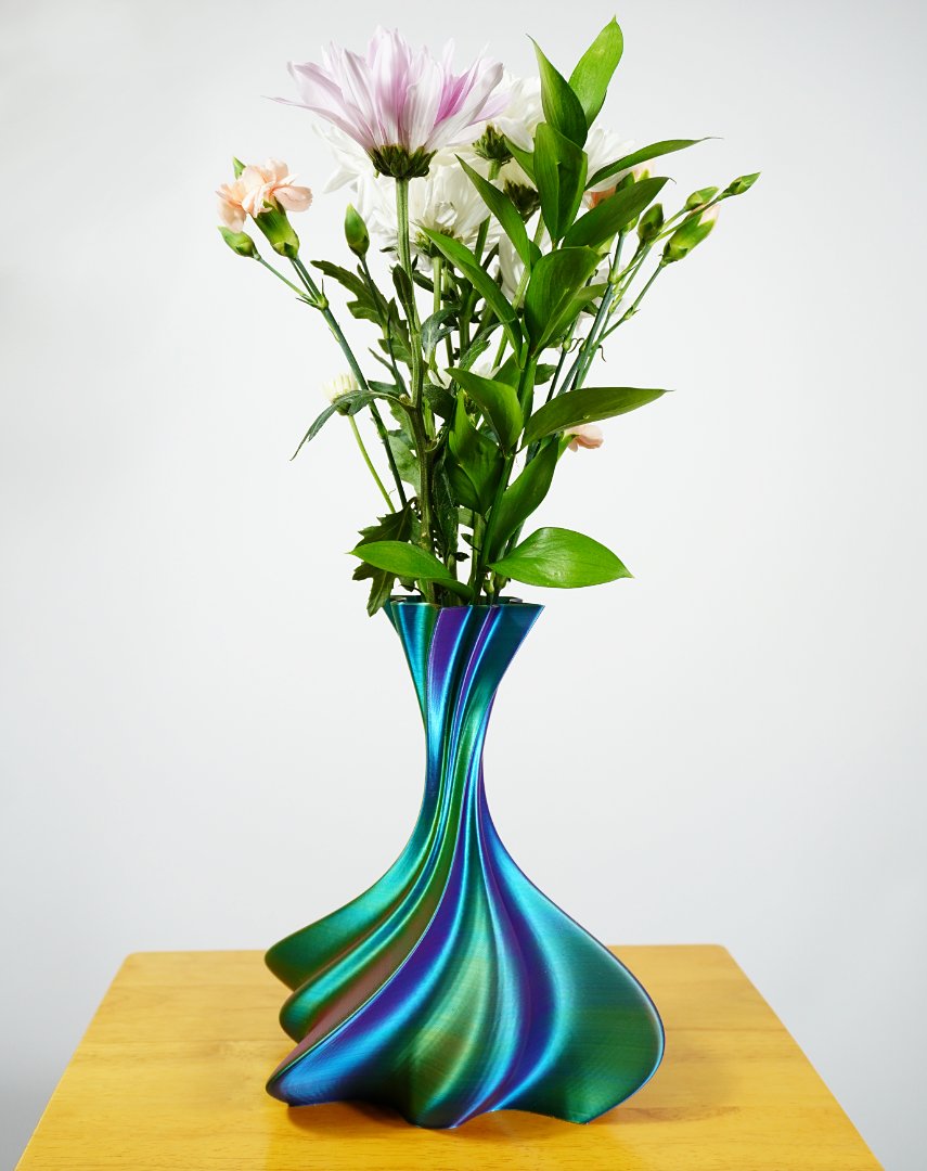 This 3D printed iridescent vase brings a futuristic, artistic touch to any room. With its smooth spiral shape and color-shifting finish, it stands out as a modern decorative piece. The surface reflects shades of purple, blue, and violet, changing depending on the light.